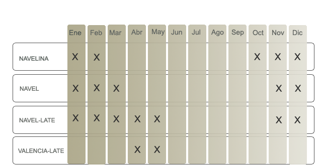 En SCORPYUS FRUITS podemos ofrecerles las variedades NAVELINA, NAVEL, NAVEL-LATE, VALENCIA-LATE, dependiendo de la época del año en que nos situemos.
